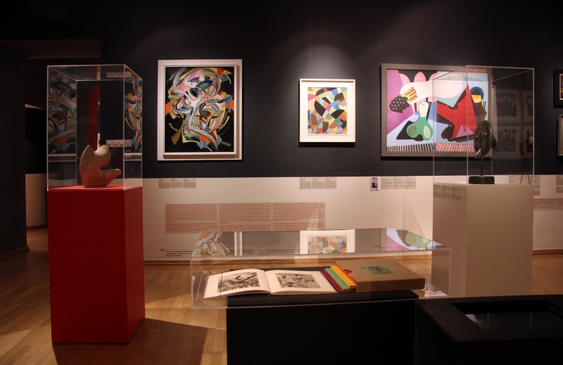 Entartete Kunst and artists’s opression, the dark stripe was a background for all works. We have also created an additional installation that allowed the visitors to peek in the 1937 actual exhibition. We have prompted curators to include in the exhibition rare film footage from the 1937 Entartete Kunst exhibition that we’ve found in the United States Holocaust memorial Museum archives. We’ve placed the film in front of a wall size photo print from the 1937 exhibition. For the design of every room in the gallery we've chosen a limited number of colors: black, white, grey and red.
